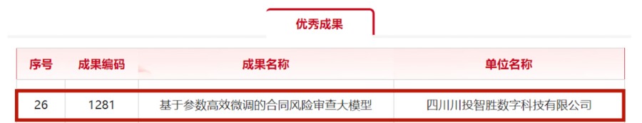 本次活動以“數(shù)據(jù)建模 賦智監(jiān)管”為主題,圍繞國資監(jiān)管和企業(yè)管控共性問題,設立了12個賽道27個賽題。川投數(shù)科憑借自主研發(fā)的“基于參數(shù)高效微調的合同風險審查大模型”,從全國772個參賽模型作品中脫穎而出,獲評“內部監(jiān)督——風險識別預警”賽道“優(yōu)秀成果”獎,成為四川省屬國有企業(yè)中唯一獲此榮譽的單位。